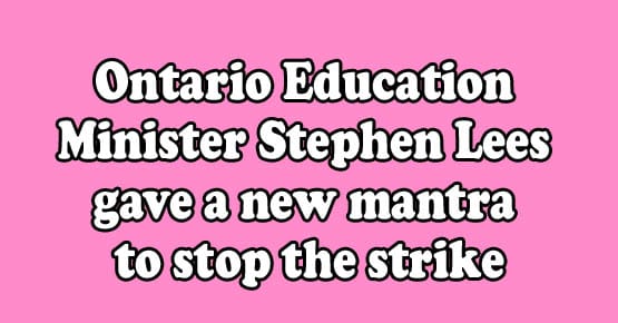 ओंटेरियो। ओंटेरियो के शिक्षामंत्री स्टीफन लीस (Ontario Education Minister Stephen Lees) ने कहा कि शैक्षणिक कर्मचारियों द्वारा आगामी हड़ताल को रोकने के लिए सरकार प्रयासों में लग गई हैं, इसके लिए आयोजित विशेष विधानसभा सत्र में शिक्षामंत्री ने नई नीति पर कार्य करने के लिए एक कथन पर जोर दिया कि कीप कीडस इन स्कूल को लागू करें, ज्ञात हो कि इस हड़ताल के अंतर्गत 55,000 शैक्षणिक कर्मचारियों अपने काम पर नहीं जाएंगे और सरकार के विरोध में प्रदर्शन करेंगे। उन्होंने यह भी बताया कि सभी शैक्षणिक कर्मचारी चार वर्ष के अनुबंध पर कार्यरत हंै और हड़ताल के लिए बार सुनिश्चित की गई हैं।